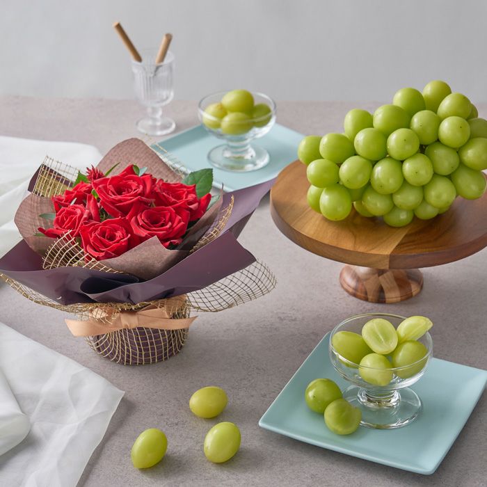 山口県柳井市に店を構えるフルーツギフト&パーラー ホシフルーツと、同じく柳井市で約3,600坪の農園を所有しバラを育てるホシファームのコラボブランド品です。フルーツのプロが厳選するシャインマスカット「晴王」と、摘みたての新鮮なバラのアレンジメントをお届けします。