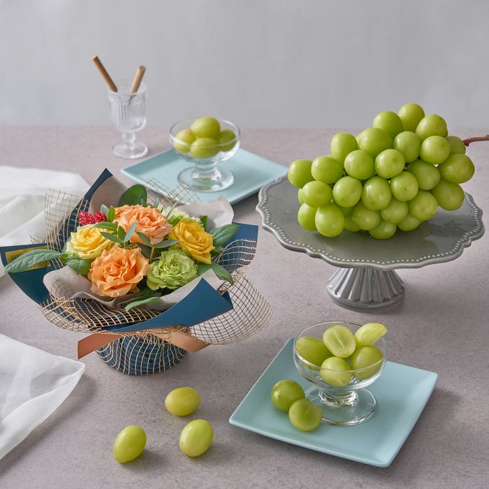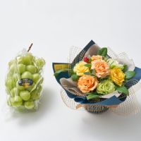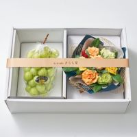 山口県柳井市に店を構えるフルーツギフト&パーラー ホシフルーツと、同じく柳井市で約3,600坪の農園を所有しバラを育てるホシファームのコラボブランド品です。フルーツのプロが厳選するシャインマスカット「晴王」と、摘みたての新鮮なバラのアレンジメントをお届けします。