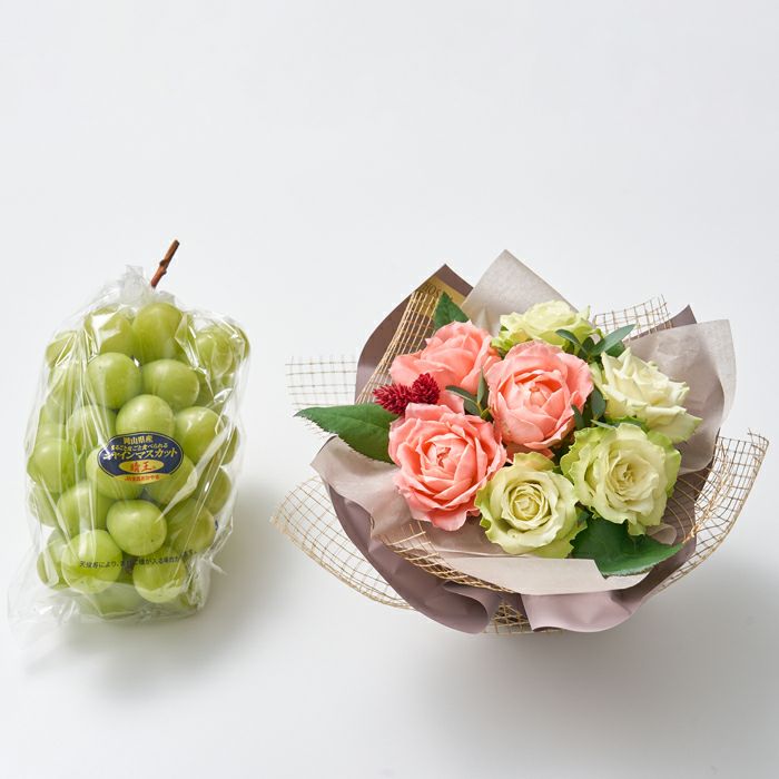 山口県産バラのアレンジメント×1、岡山県産シャインマスカット晴王×1、商品紹介・花のお手入れ・シャインマスカットのしおり×各1